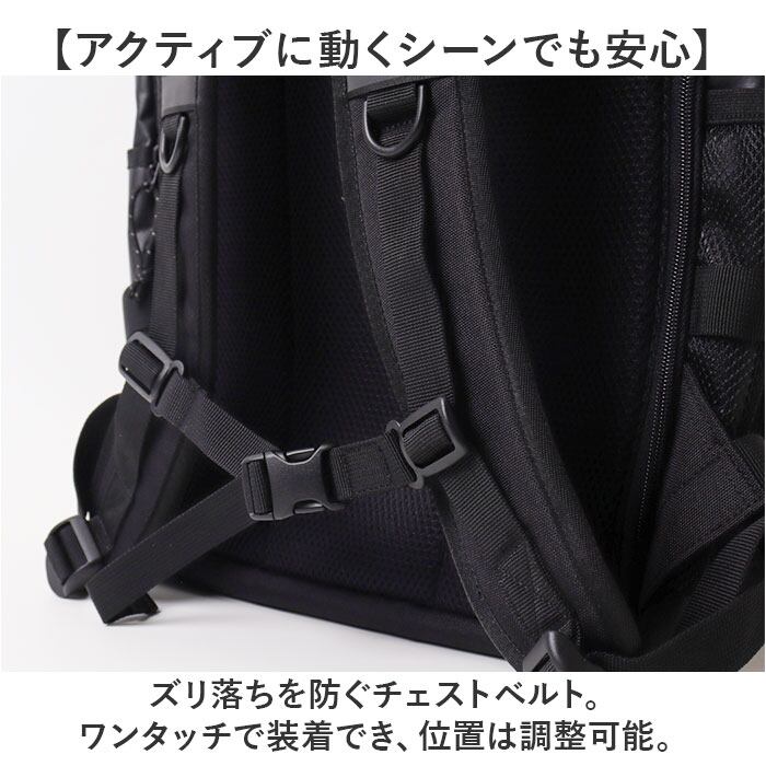 ・ズリ落ちを防ぐチェストベルト。ワンタッチで装着でき、位置は調整可能。