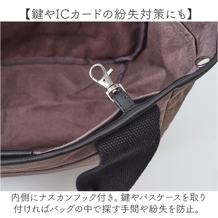 ・内側にナスカンフック付き。鍵やパスケースを取り付ければバッグの中で探す手間や紛失を防止。