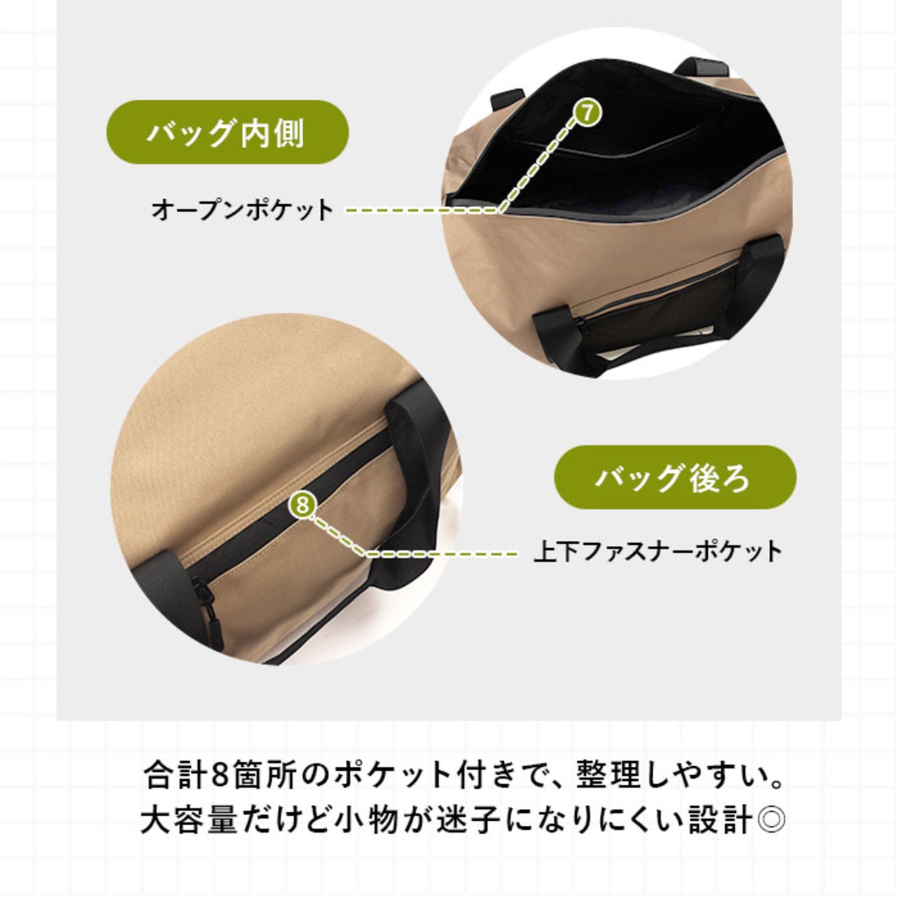 ・内側・外側合わせて8個のポケットを装備!小物が迷子になりにくく、整理整頓もラクラク。