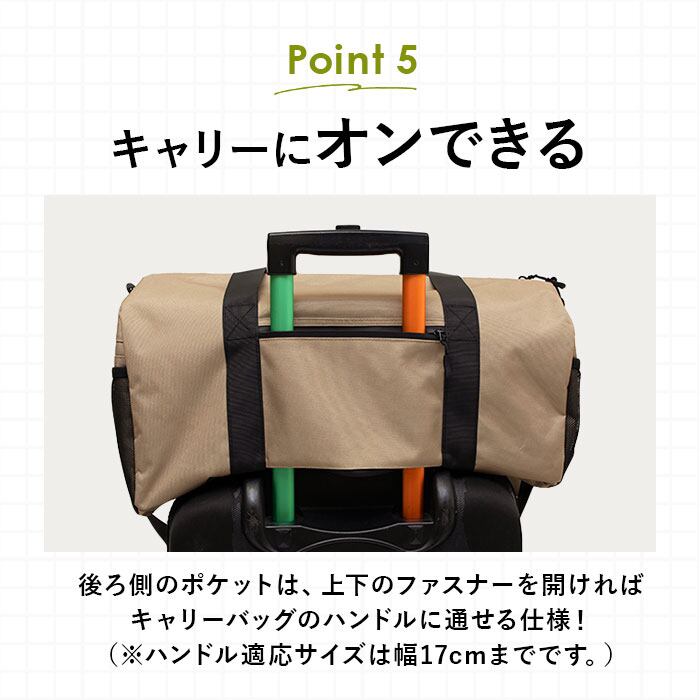 ・背面ポケット上下のファスナーを開けると、キャリーケースのハンドルに通せるキャリーオン仕様。移動がスムーズに!(※ハンドル適応サイズは幅17cmまでです。)