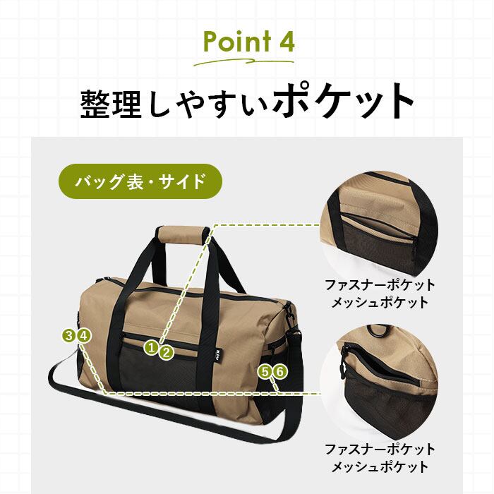 ・サイド:メッシュポケット×2、ファスナーポケット×2