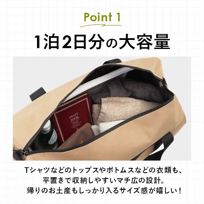 ・しっかりとマチを設けた、シンプルなワンルーム仕様。着替えやタオルなどのざっくり収納できる容量31Lサイズ!旅行やレジャー、荷物の多い日のお出かけに最適◎