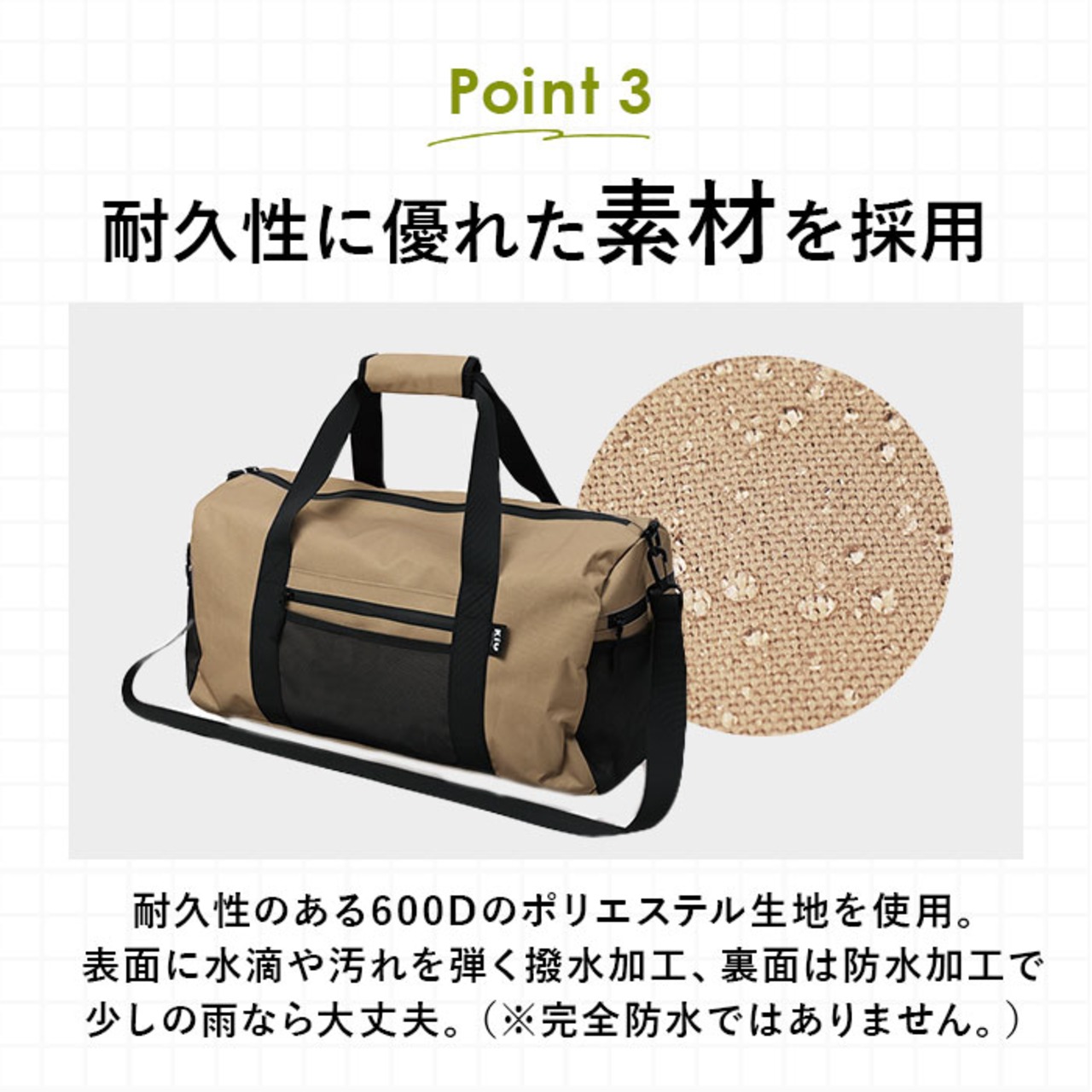・耐久性のある600Dのポリエステル生地を使用。表面に水滴や汚れをサッと弾くはっ水加工、裏面に防水加工済みでちょっとの雨なら大丈夫。(※完全防水ではありません。)
