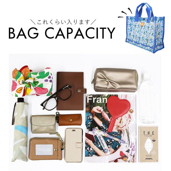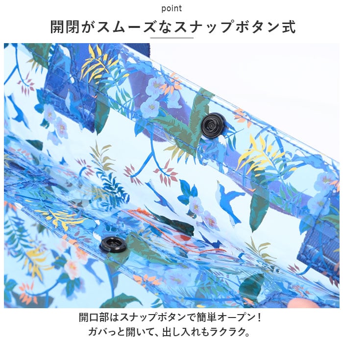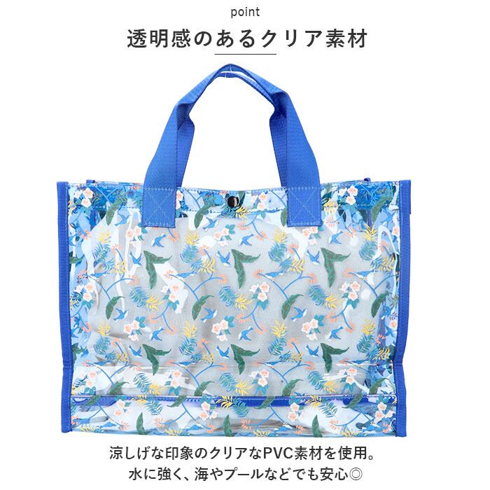 ・涼しげな印象のクリアなPVC素材を使用。水に強く、海やプールなどでも安心◎