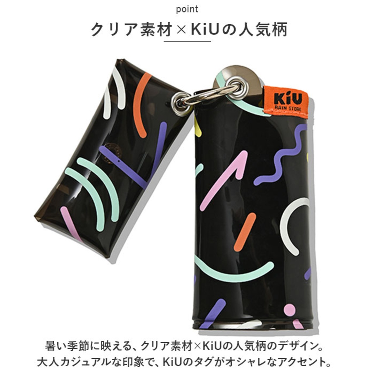 ・暑い季節に映える、クリア素材×KiUの人気柄のデザイン。大人カジュアルな印象で、KiUのタグがオシャレなアクセント。お出かけ先でもパッと目を引くこと間違いなし☆