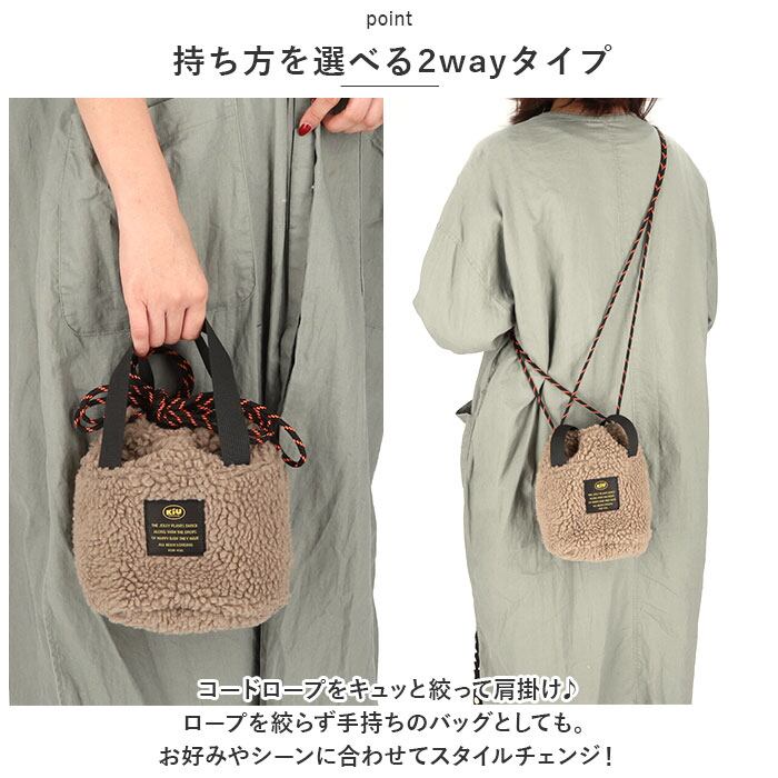 ・コードロープをキュッと絞って肩掛け♪ロープを絞らず手持ちのバッグとしても。お好みやシーンに合わせてスタイルチェンジ!
