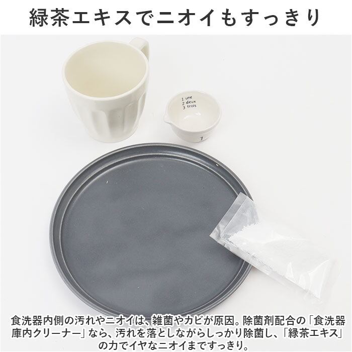 ・食洗器内側の汚れやニオイは、雑菌やカビが原因。除菌剤配合の「食洗器庫内クリーナー」なら、汚れを落としながらしっかり除菌し、「緑茶エキス」の力でイヤなニオイまですっきり。