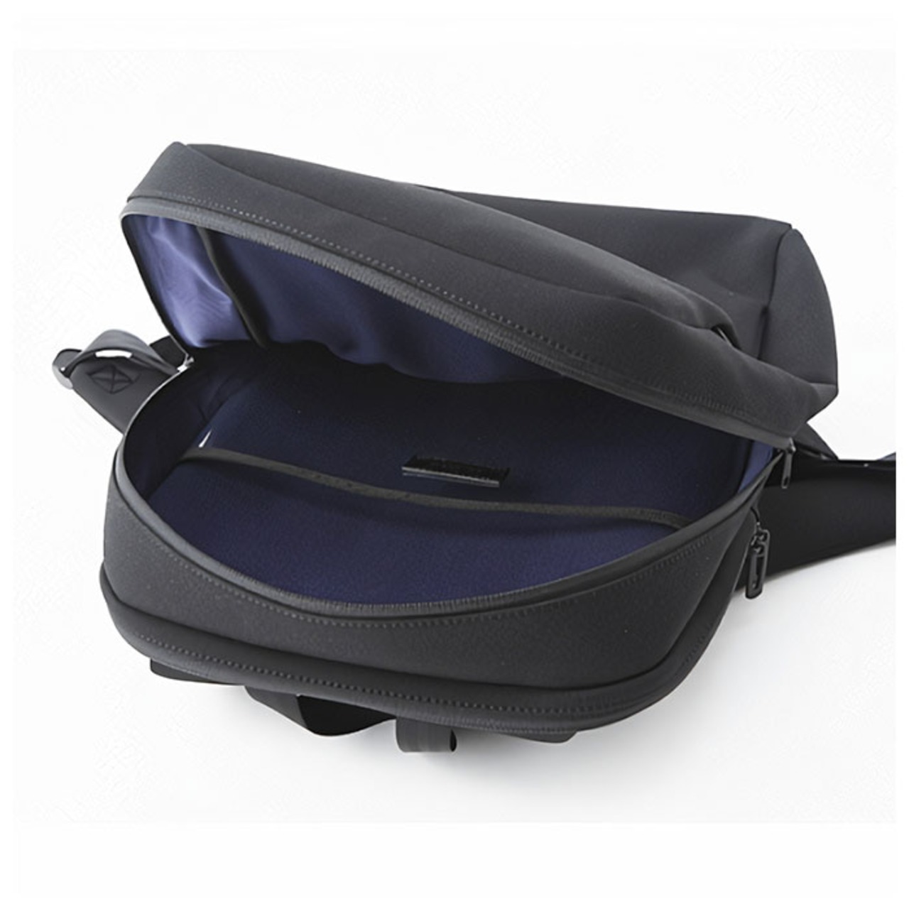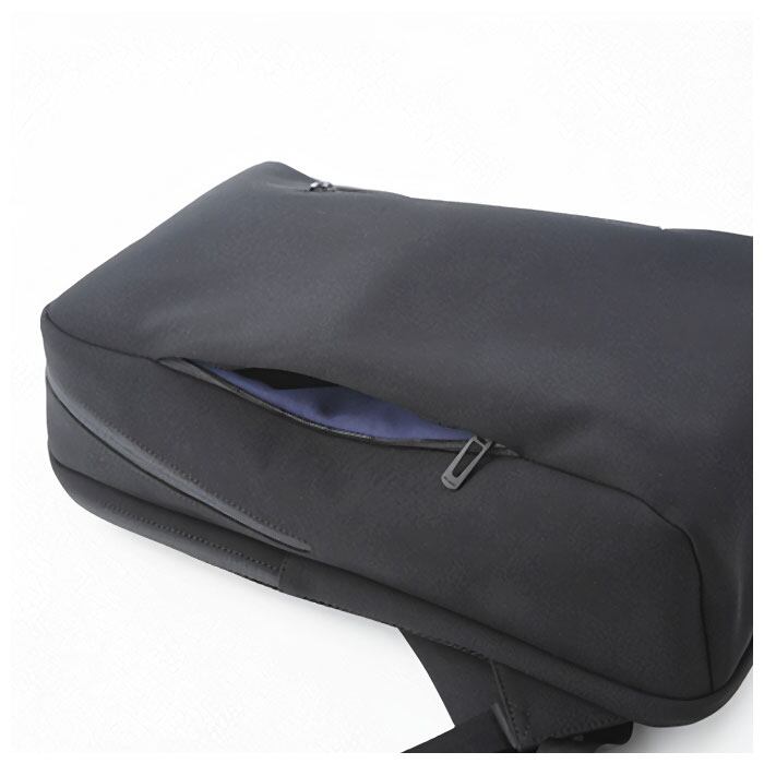 ・デザインのポイントになっている斜めファスナーには、雨水が侵入しにくい止水ファスナーを採用しているため、スマホやガジェット類の収納も安心。
