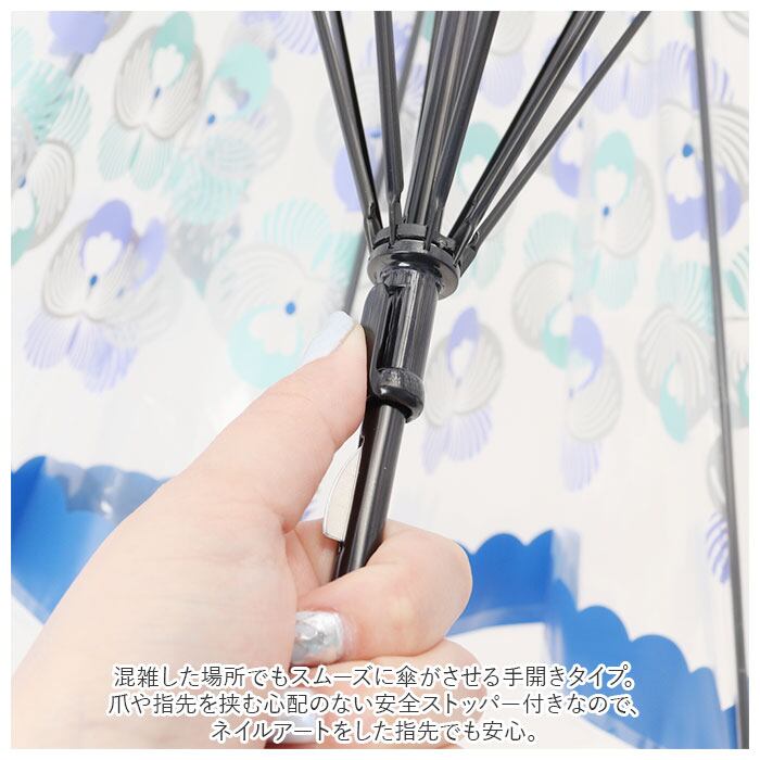 ・混雑した場所でもスムーズに傘がさせる手開きタイプ。爪や指先を挟む心配のない安全ストッパー付きなので、ネイルアートをした指先でも安心。