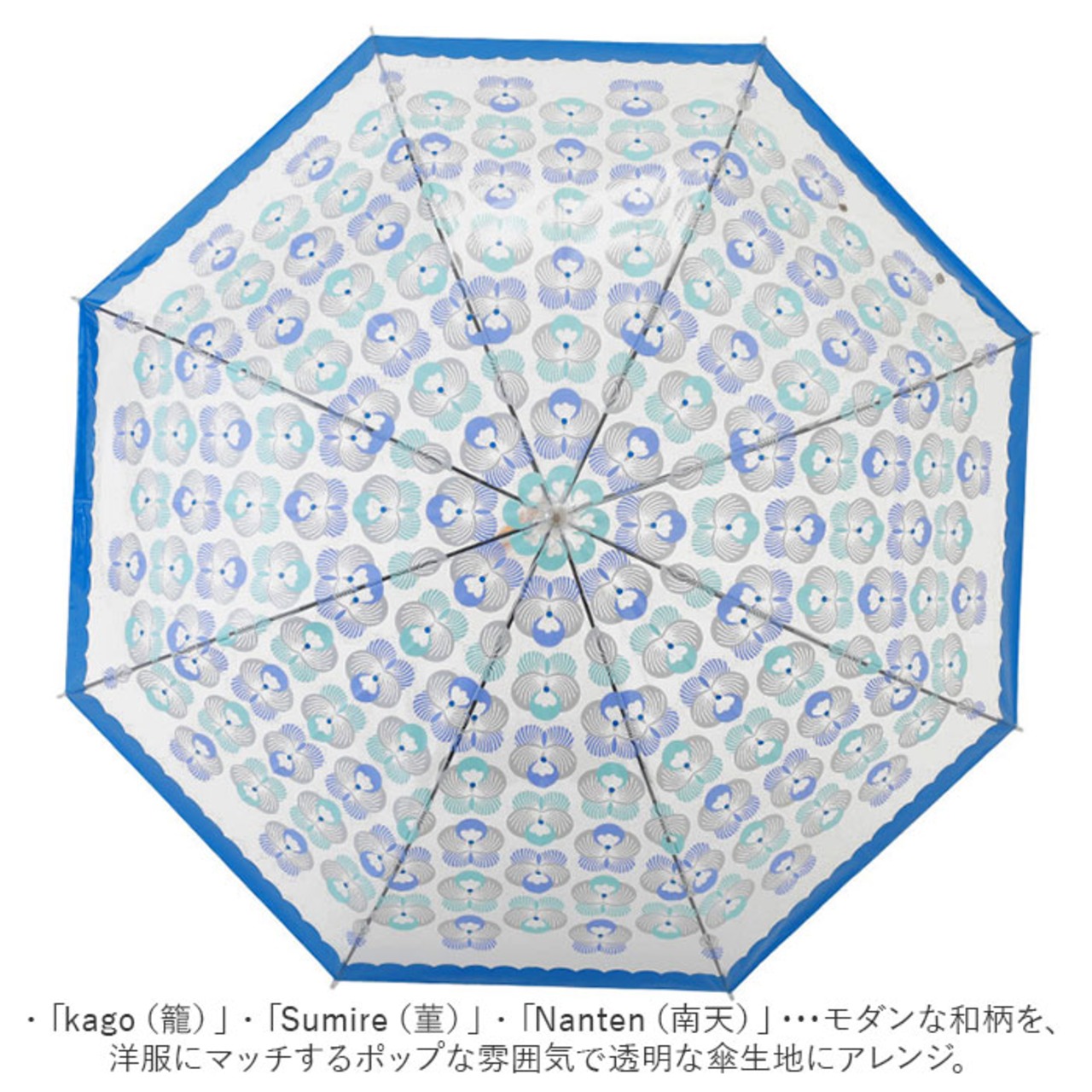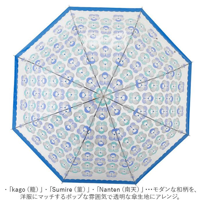 ・「kago(籠)」・「Sumire(菫)」・「Nanten(南天)」・・・モダンな和柄を、洋服にマッチするポップな雰囲気で透明な傘生地にアレンジ。