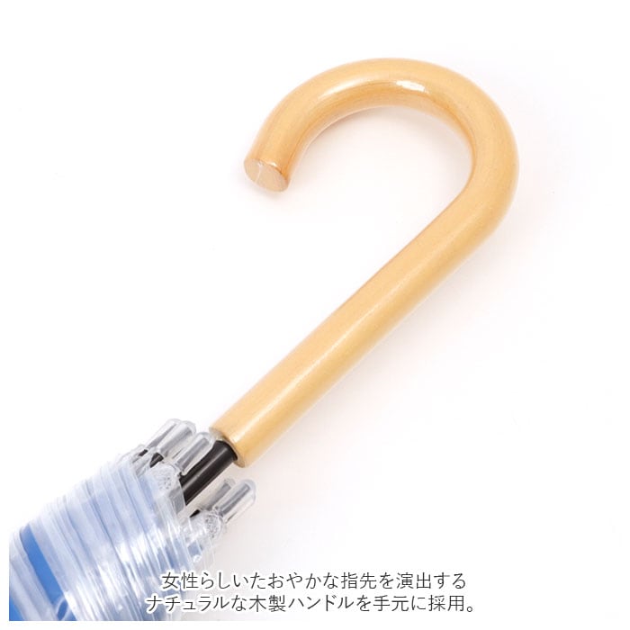 ・ビニール傘では珍しい、女性らしいたおやかな指先を演出するナチュラルな木製ハンドルを手元に採用。