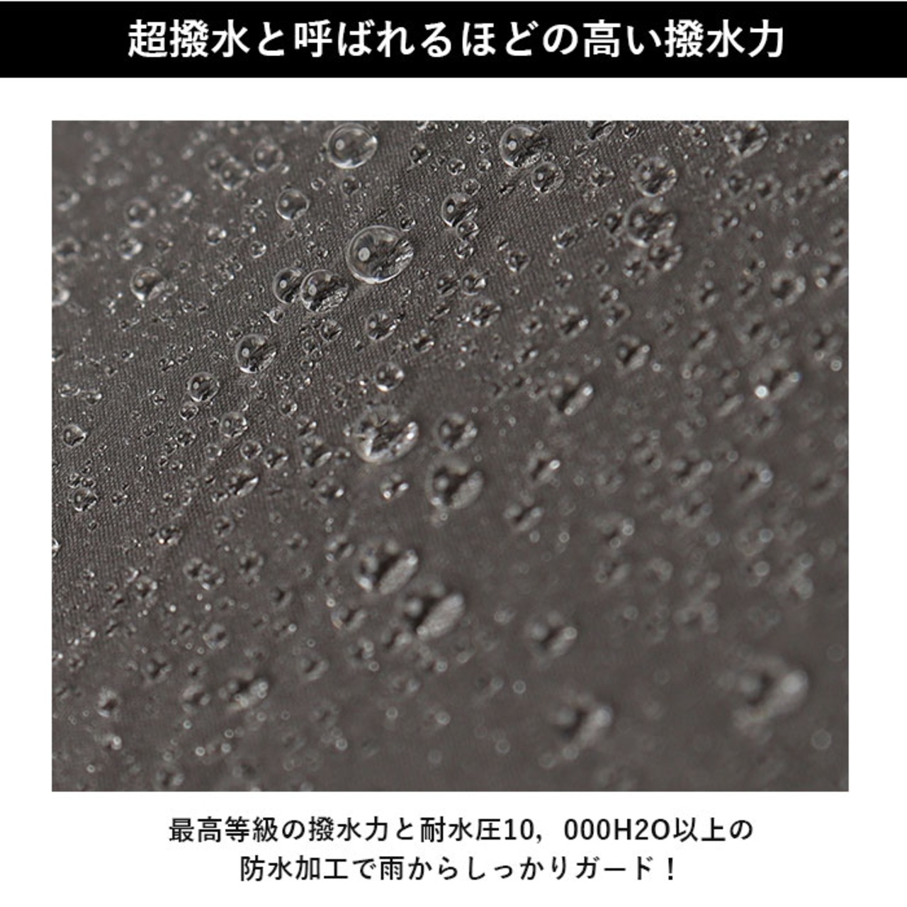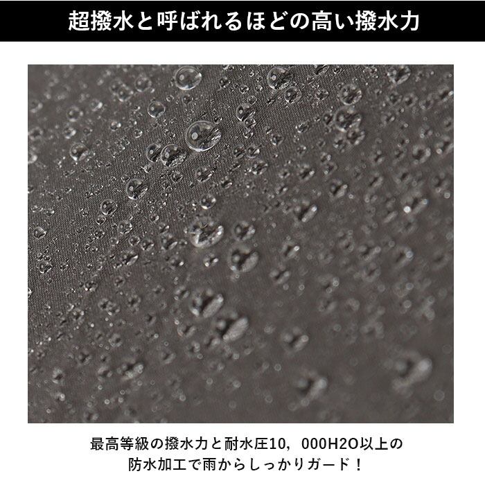 ・最高等級の撥水力と耐水圧10,000mmH2O以上の防水加工で雨からしっかりガード!