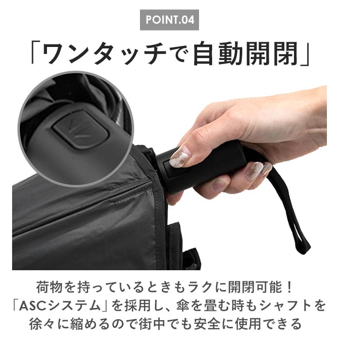 ・ASCシステムを採用し、傘を畳む時もシャフトを徐々に縮めるので安全に使用できるのもポイント。