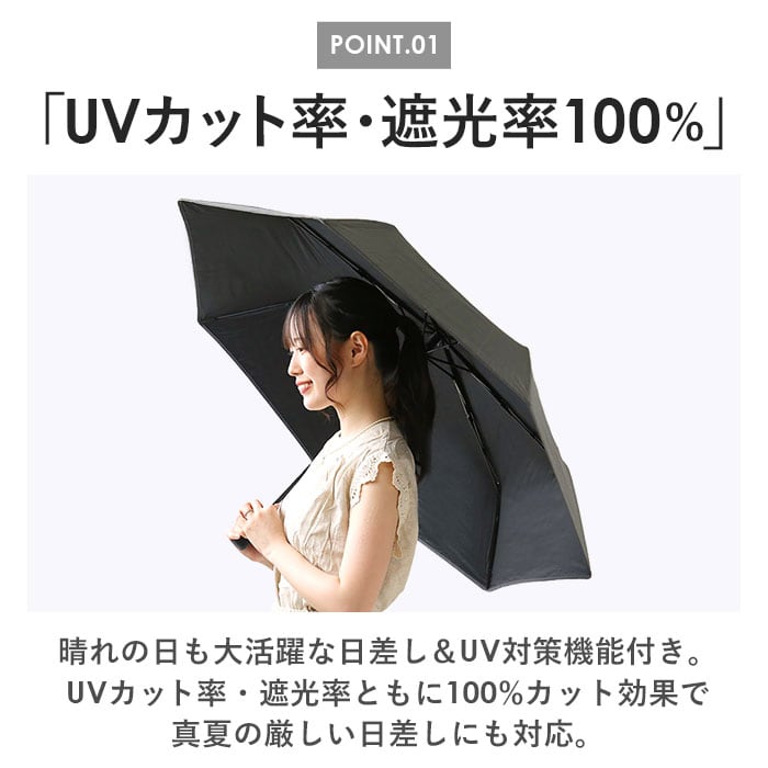 ・晴れの日も大活躍な日差し&UV対策機能付き。UVカット率・遮光率ともに100%カット効果で真夏の厳しい日差しにも対応。