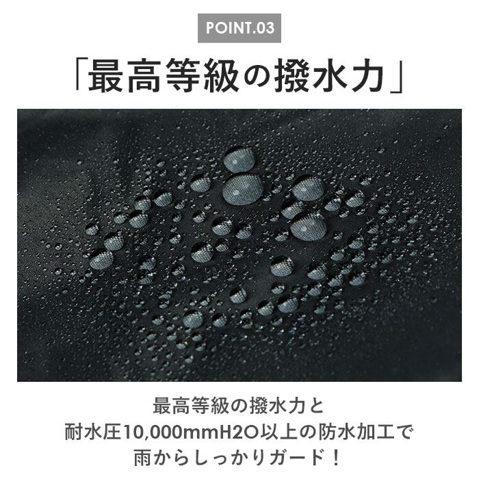 ・最高等級の撥水力と耐水圧10,000mmH2O以上の防水加工で雨からしっかりガード!