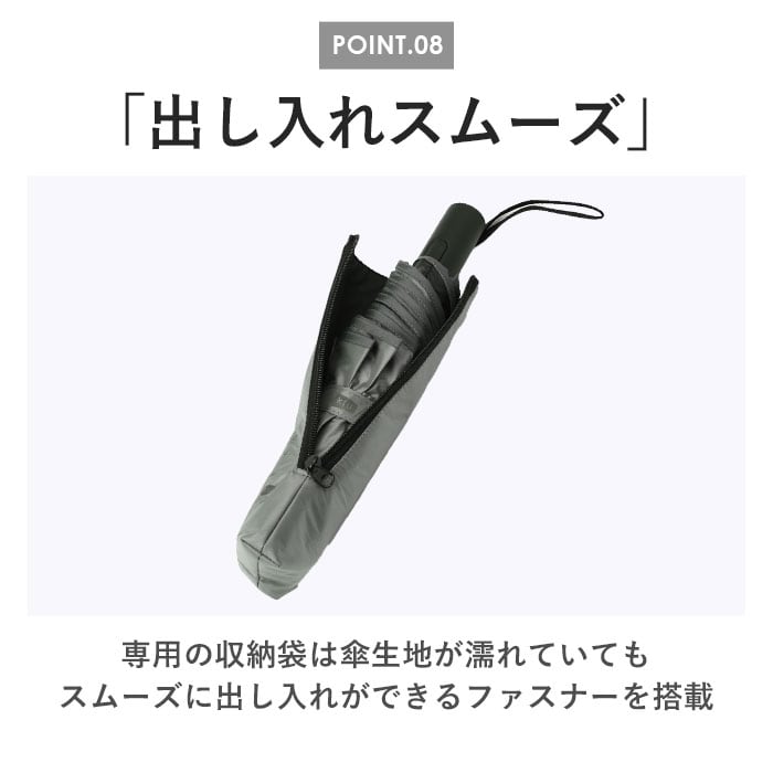 ・専用の収納袋は傘生地が濡れていてもスムーズに出し入れができるファスナーを搭載。