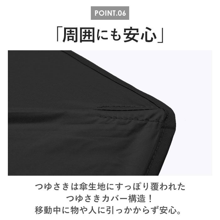・つゆさきは傘生地にすっぽり覆われたつゆさきカバー構造!移動中物や人に引っかからず安心。