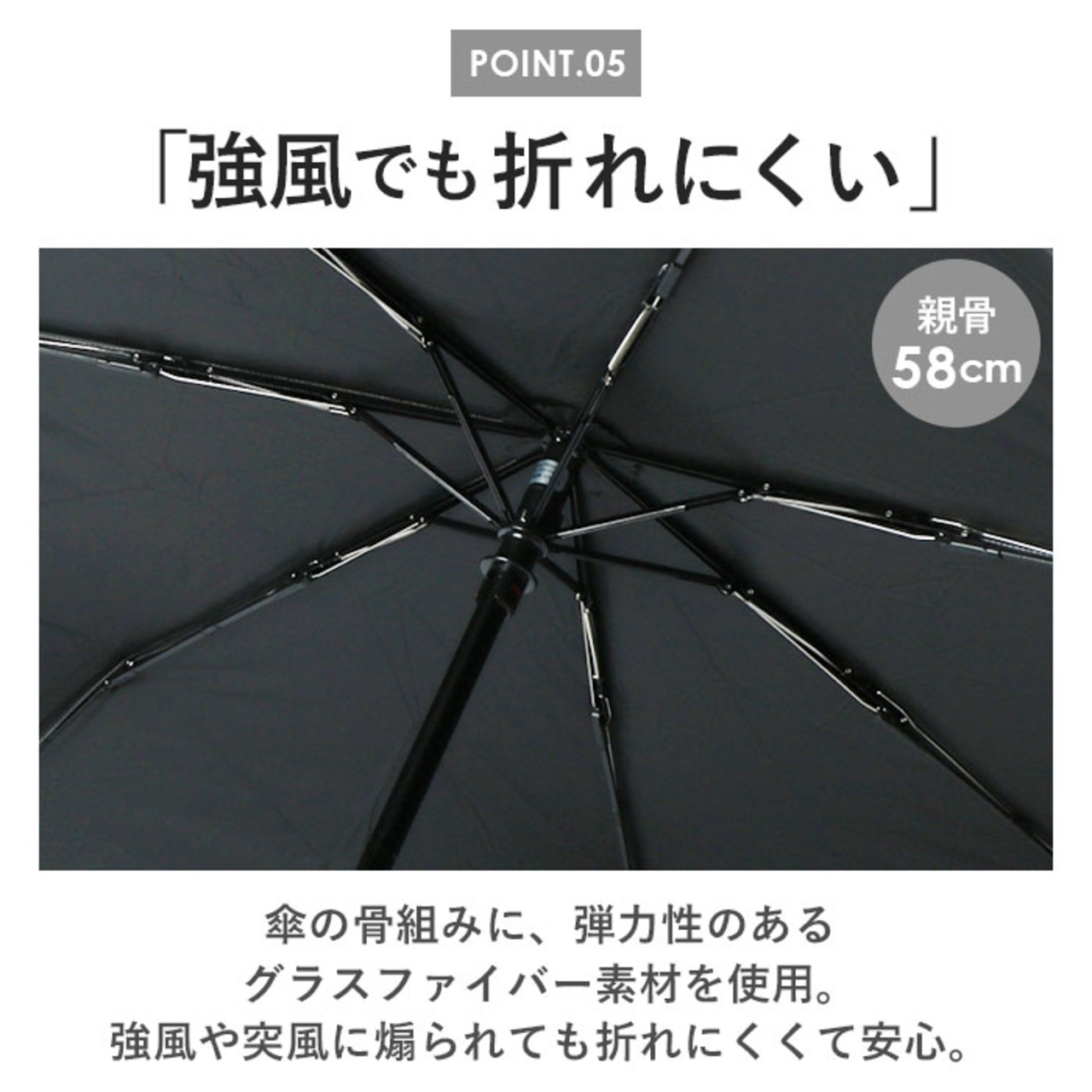 ・傘の骨組みに、弾力性のあるグラスファイバー素材を使用。強風や突風に煽られても折れにくくて安心。