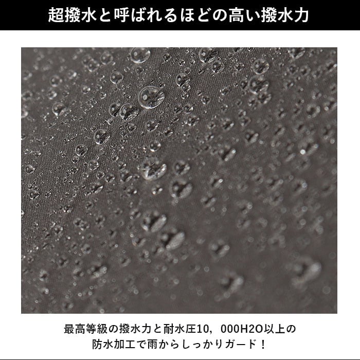 ・最高等級の撥水力と耐水圧10,000H2O以上の防水加工で雨からしっかりガード!