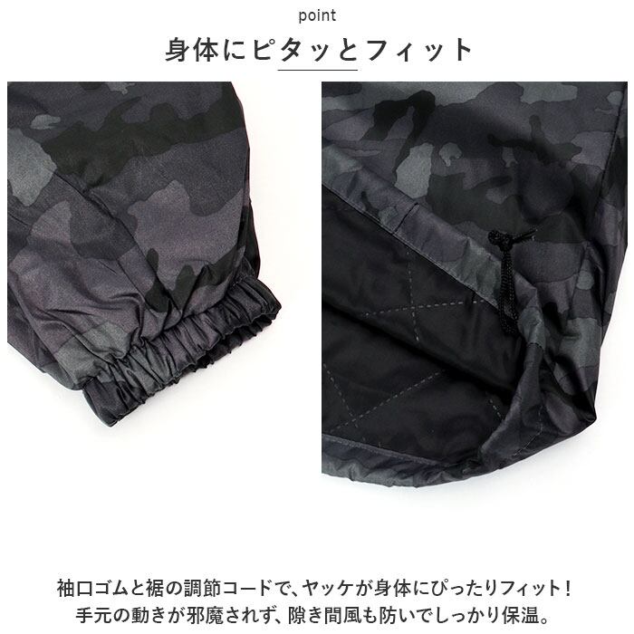 ・袖口ゴムと裾の調節コードで、ヤッケが身体にぴったりフィット!手元の動きが邪魔されず、隙き間風も防いでしっかり保温。