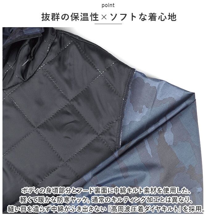 ・ボディの身頃部分とフード裏面に中綿キルト素材を使用した、軽くて暖かな防寒ヤッケ。通常のキルティング加工とは異なり、縫い目を造らず中綿がふき出さない「高周波圧着ダイヤキルト」を採用。
