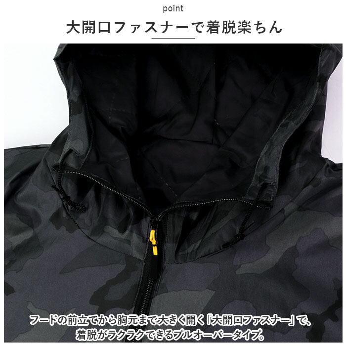 ・フードの前立てから胸元まで大きく開く「大開口ファスナー」で、着脱がラクラクできるプルオーバータイプ。