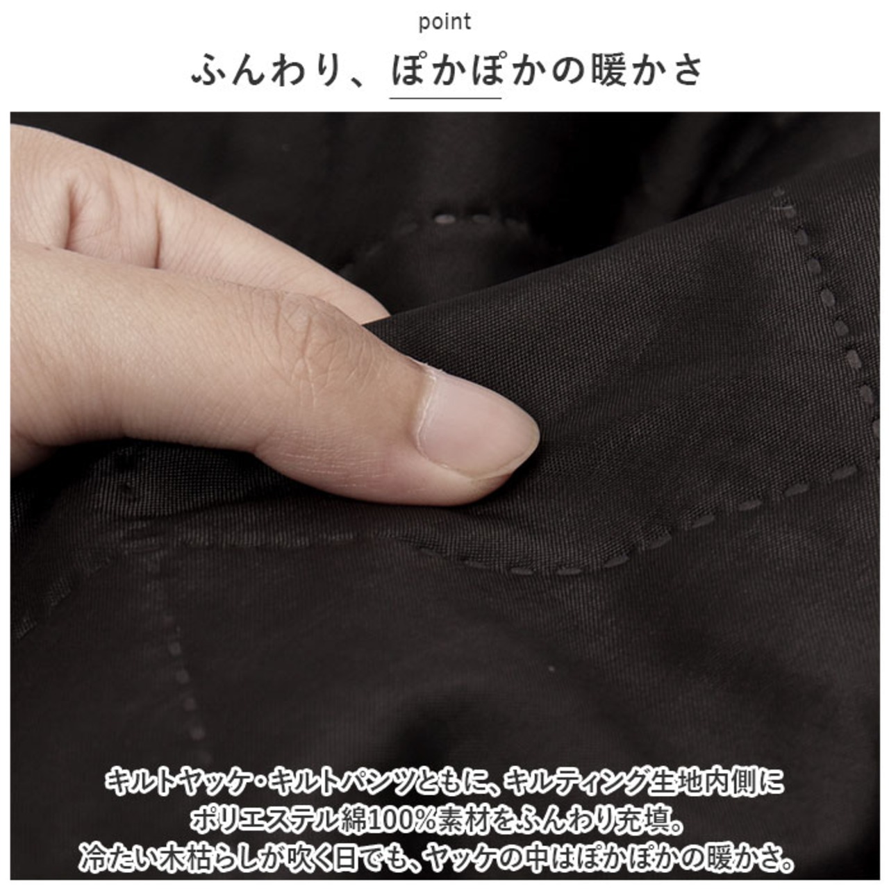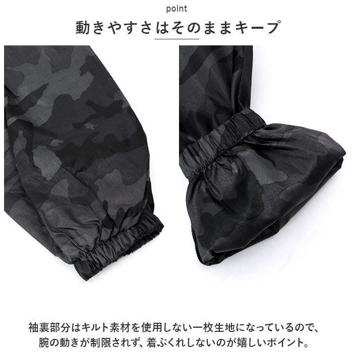・セミキルトヤッケ・キルトパンツともに、キルティング生地内側にポリエステル綿100%素材をふんわり充填。冷たい木枯らしが吹く日でも、ウェアの中はぽかぽかの暖かさ。