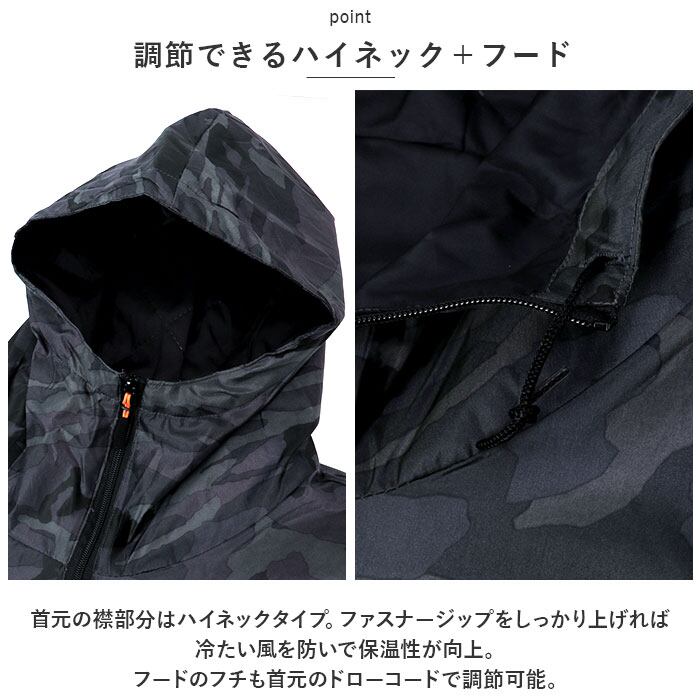 ・首元の襟部分はハイネックタイプ。ファスナージップをしっかり上げれば冷たい風を防いで保温性が向上。フードのフチも首元のドローコードで調節可能。