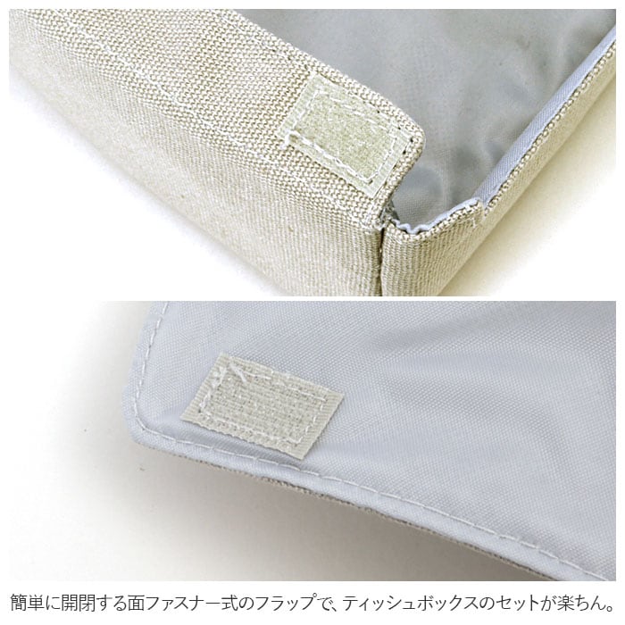 ・簡単に開閉する面ファスナー式のフラップで、ティッシュボックスのセットが楽ちん。