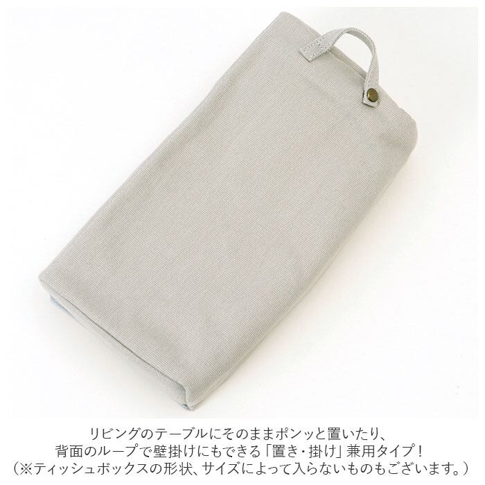 ・リビングのテーブルにそのままポンッと置いたり、背面のループで壁掛けにもできる「置き・掛け」兼用タイプ!(※ティッシュボックスの形状、サイズによって入らないものもございます。)
