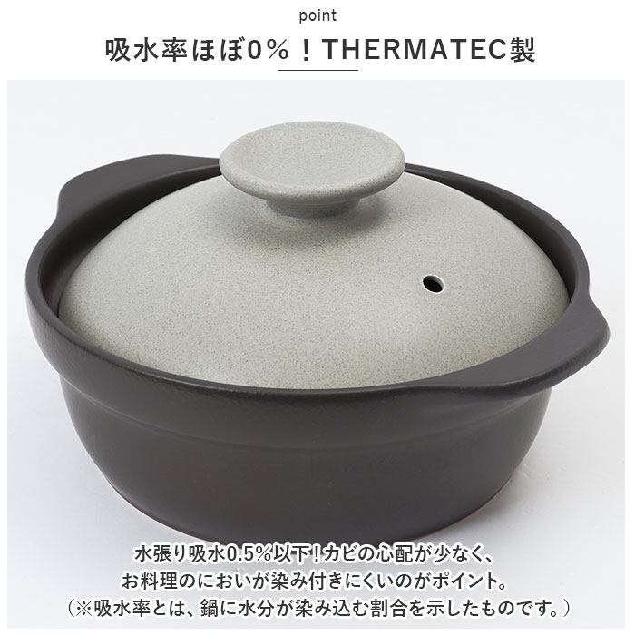 ・水張り吸水0.5%以下!カビの心配が少なく、お料理のにおいが染み付きにくいのがポイント。(※吸水率とは、鍋に水分が染み込む割合を示したものです。)