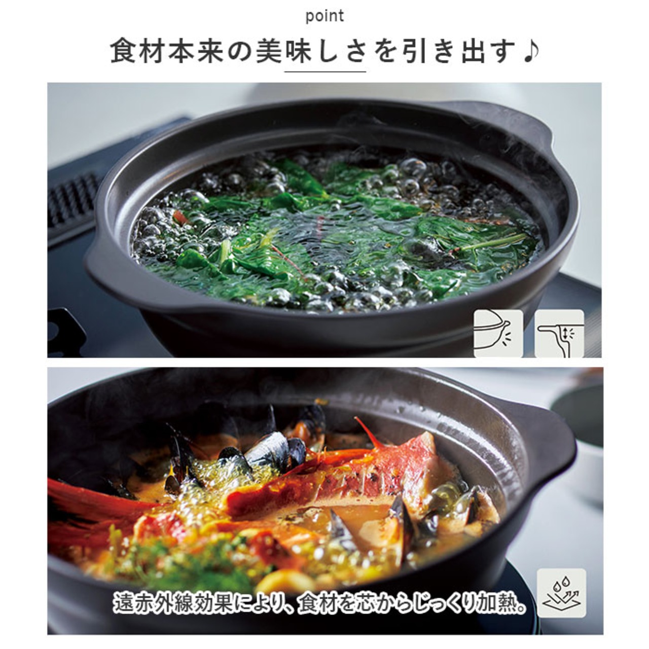 ・遠赤外線効果により、食材を芯からじっくり加熱。