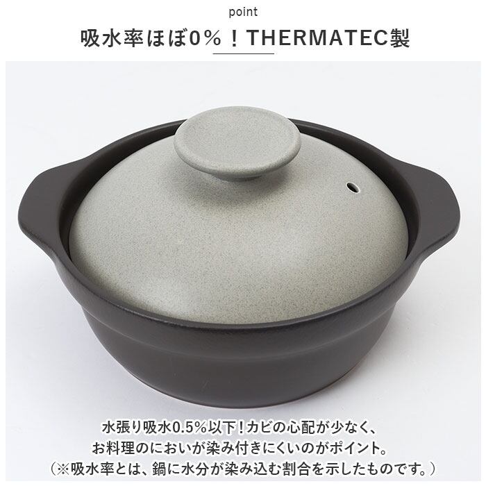 ・水張り吸水0.5%以下!カビの心配が少なく、お料理のにおいが染み付きにくいのがポイント。(※吸水率とは、鍋に水分が染み込む割合を示したものです。)