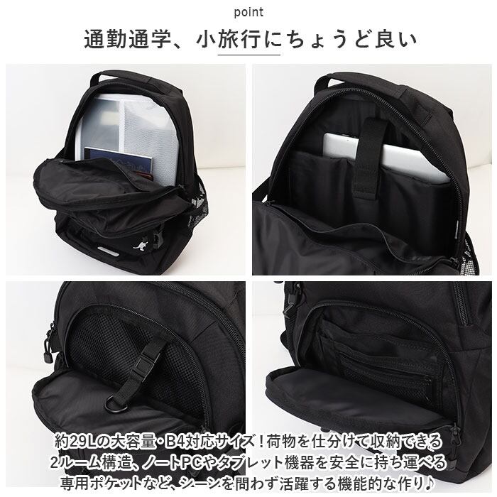・約29Lの大容量・B4対応サイズ!荷物を仕分けて収納できる2ルーム構造、ノートPCやタブレット機器を安全に持ち運べる専用ポケットなど、デイリーユースにもちょっとした旅行にもシーン問わず活躍する機能的な作り♪
