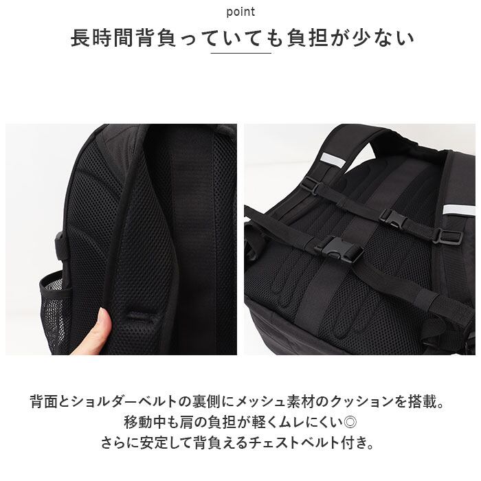 ・背面とショルダーベルトの裏側にメッシュ素材のクッションを搭載。移動中も肩の負担が軽くムレにくい◎