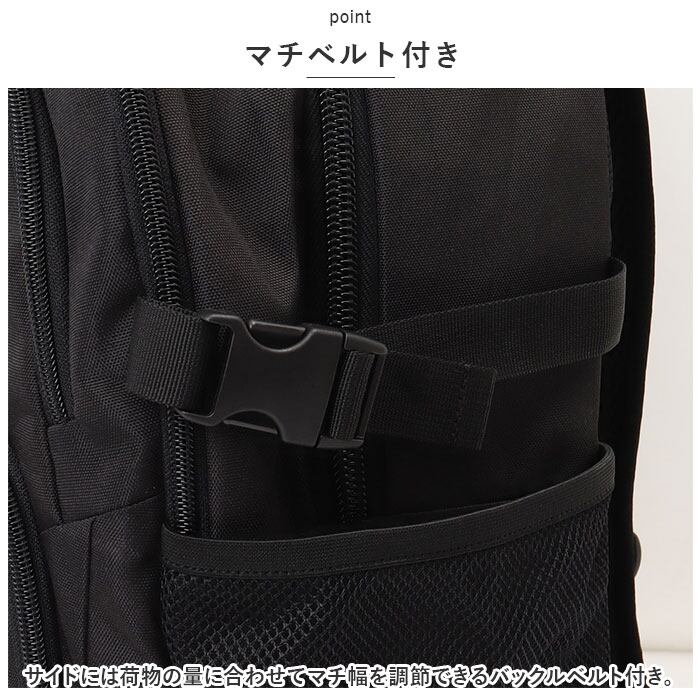 ・サイドには荷物の量に合わせてマチ幅を調節できるバックルベルト付き。