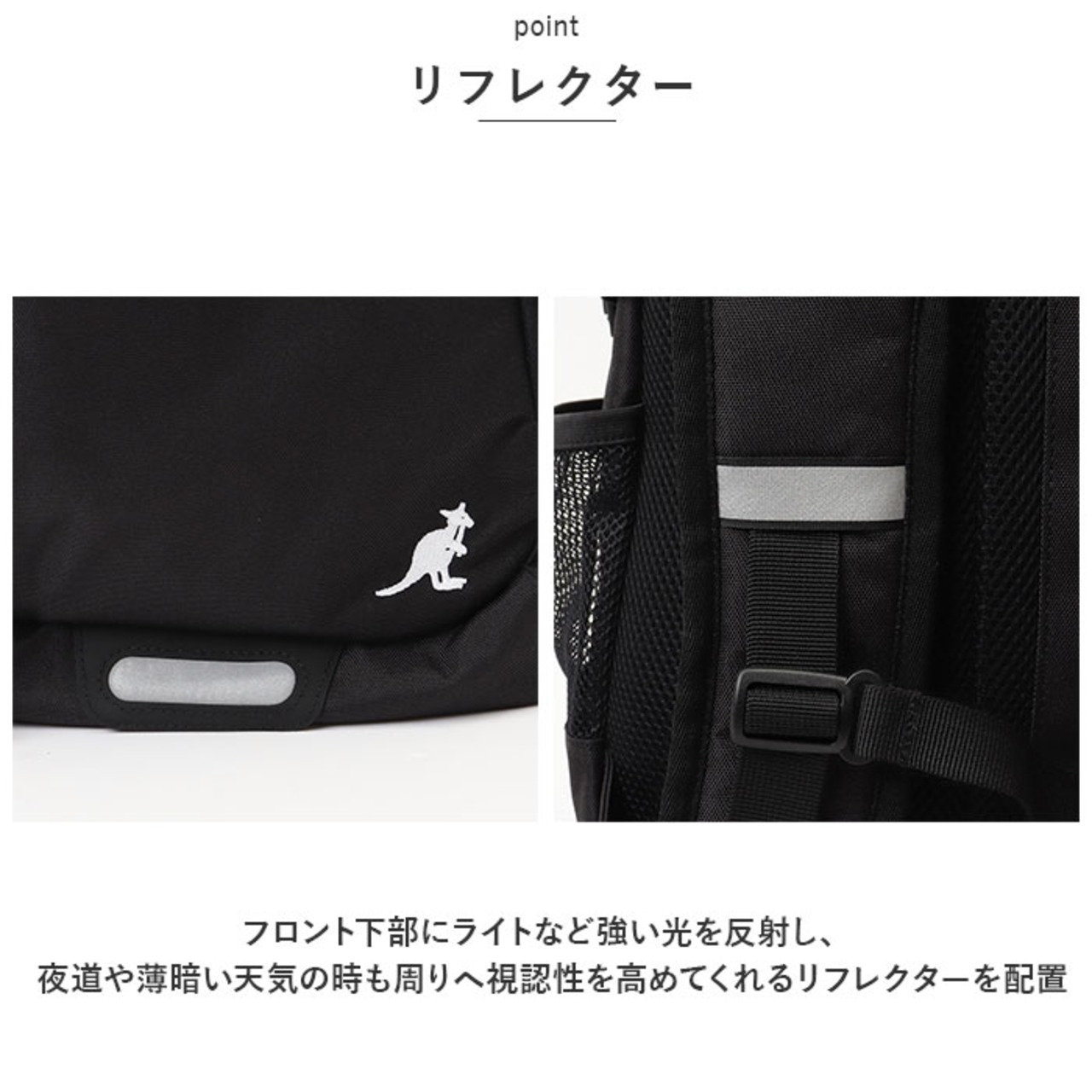 ・フロント下部にライトなど強い光を反射し、夜道や薄暗い天気の時も周りへ視認性を高めてくれるリフレクターを配置。