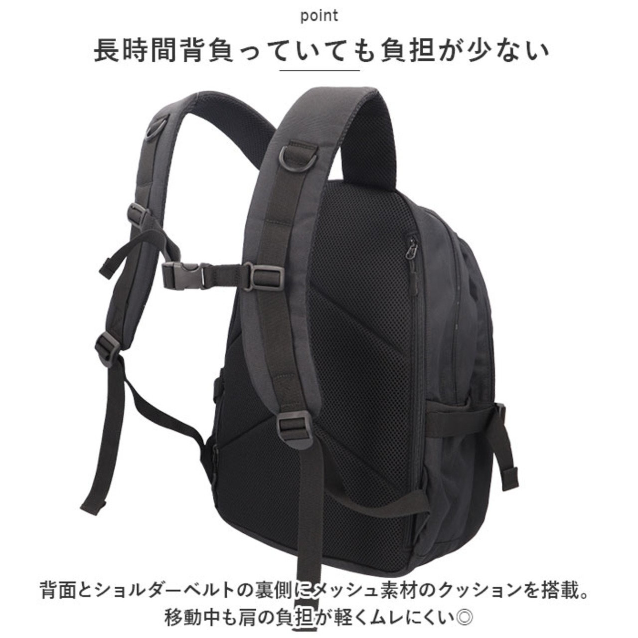 ・背面とショルダーベルトの裏側にメッシュ素材のクッションを搭載。移動中も肩の負担が軽くムレにくい◎