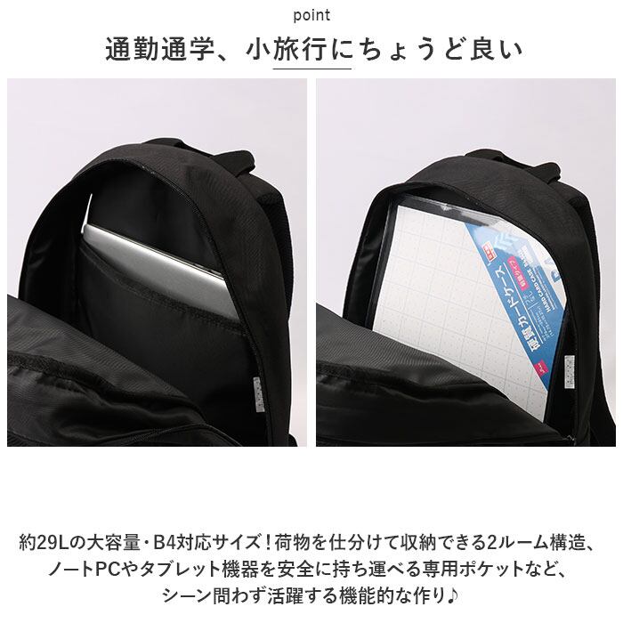 ・約29Lの大容量・B4対応サイズ!荷物を仕分けて収納できる2ルーム構造、ノートPCやタブレット機器を安全に持ち運べる専用ポケットなど、デイリーユースにもちょっとした旅行にもシーン問わず活躍する機能的な作り♪