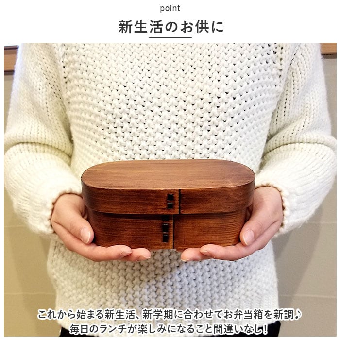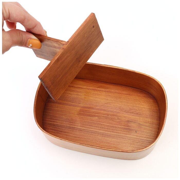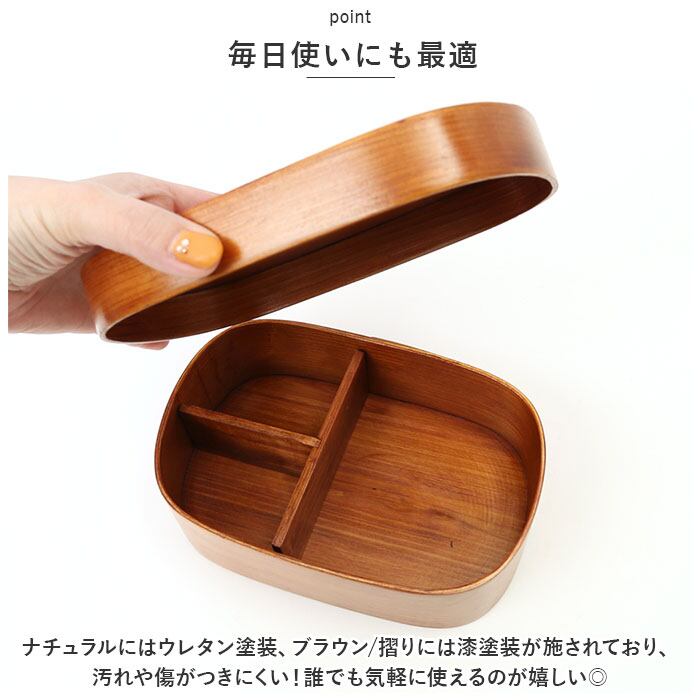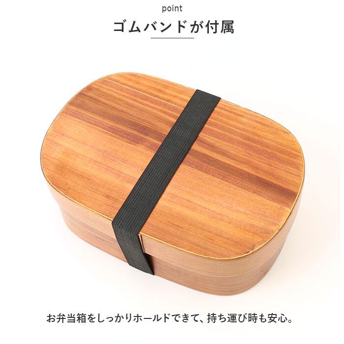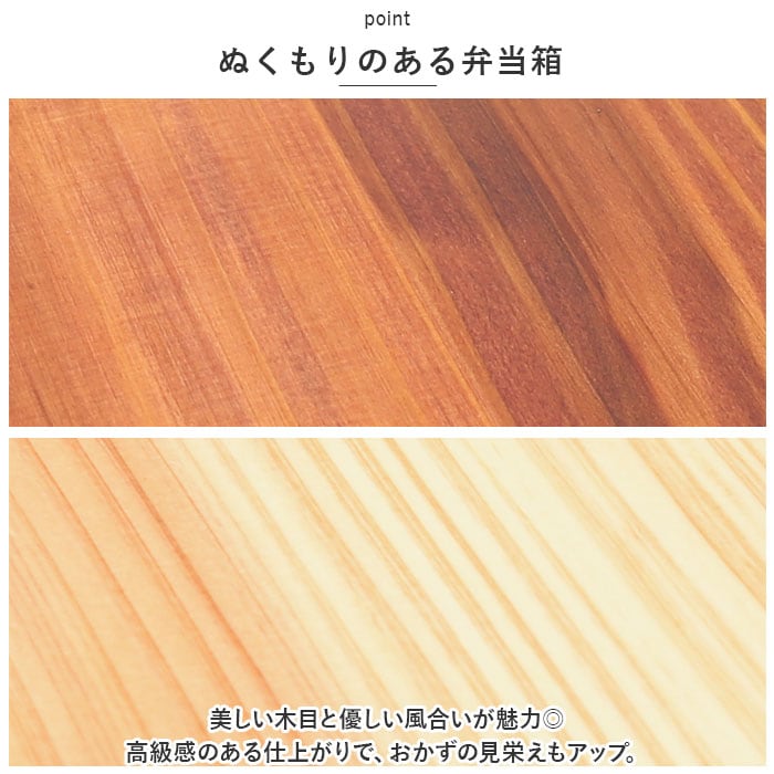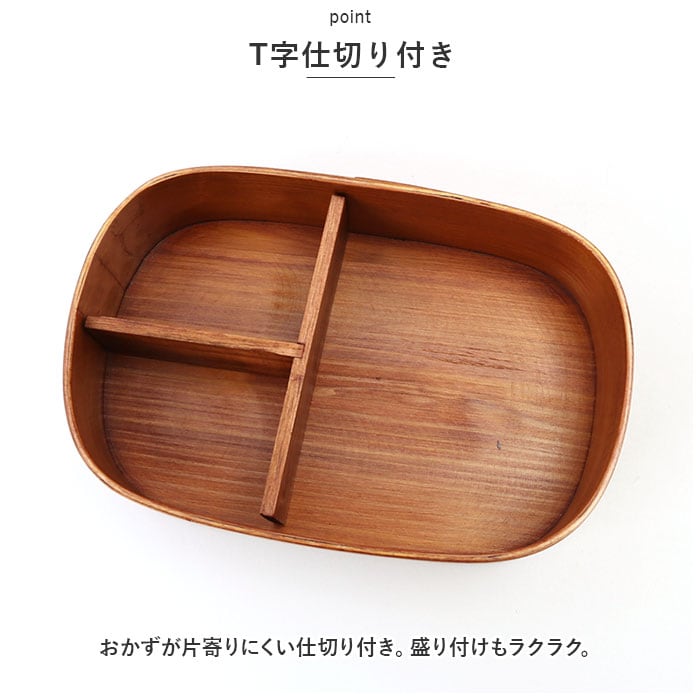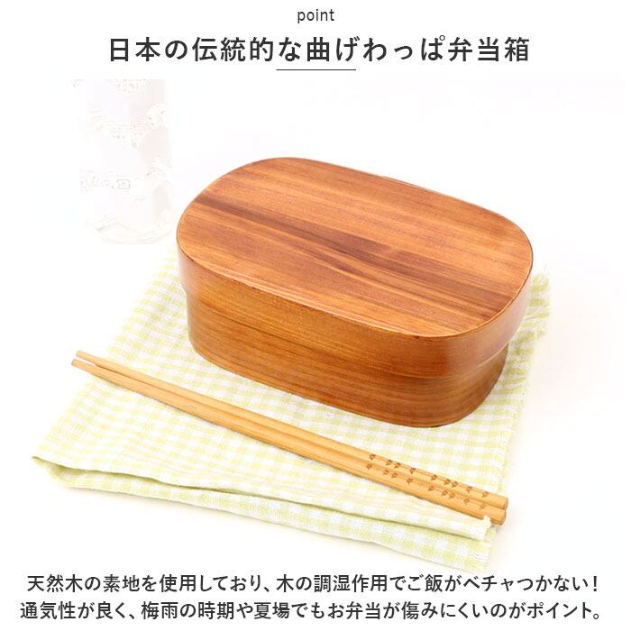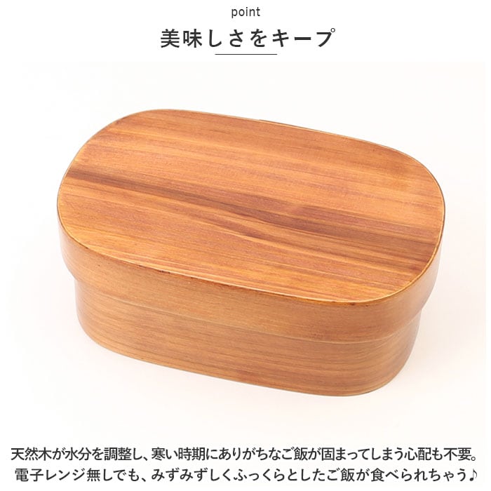 ・天然木の素地を使用しており、木の調湿作用でご飯がベチャつかない!通気性が良く、梅雨の時期や夏場でもお弁当が傷みにくいのがポイント。