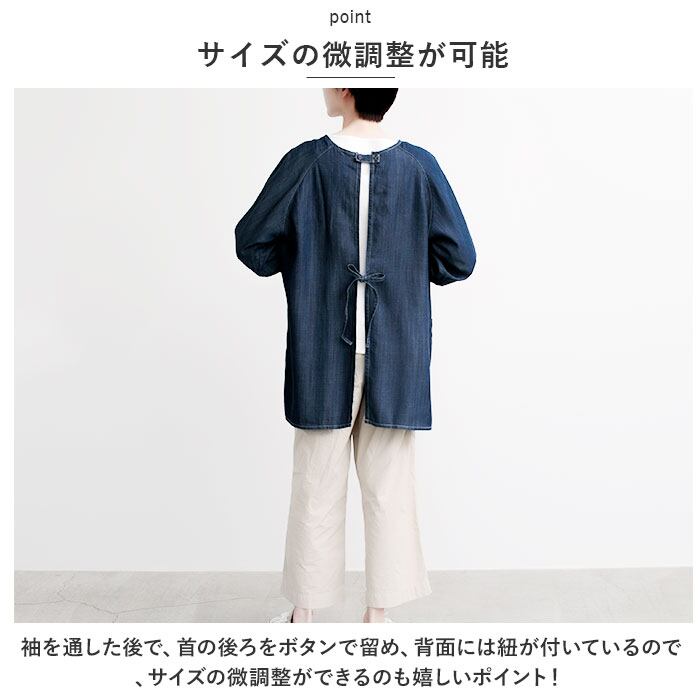 9分丈の割烹着タイプなので作業の邪魔をすることなく、お洋服を汚れからしっかりガードしてくれる!