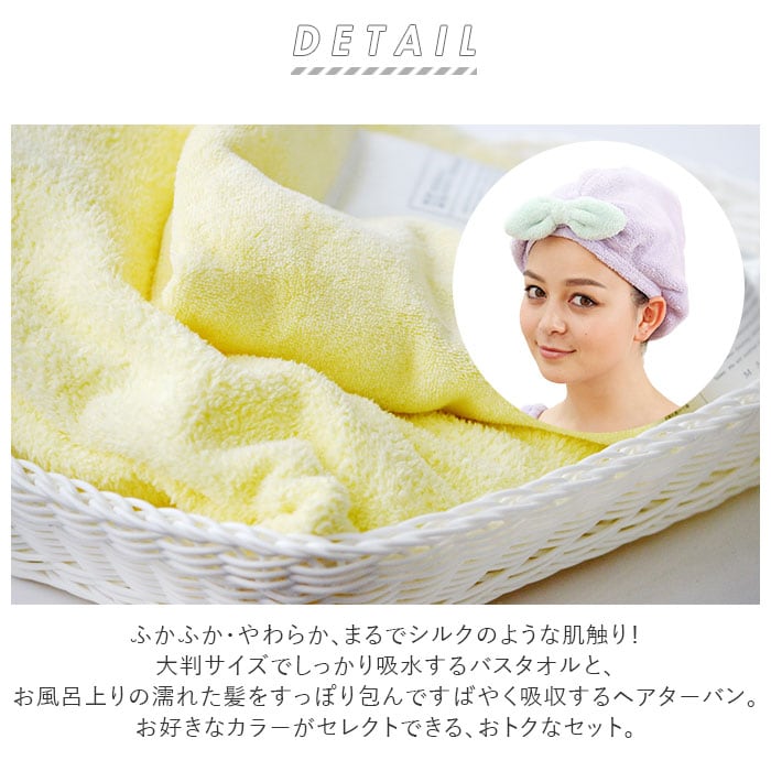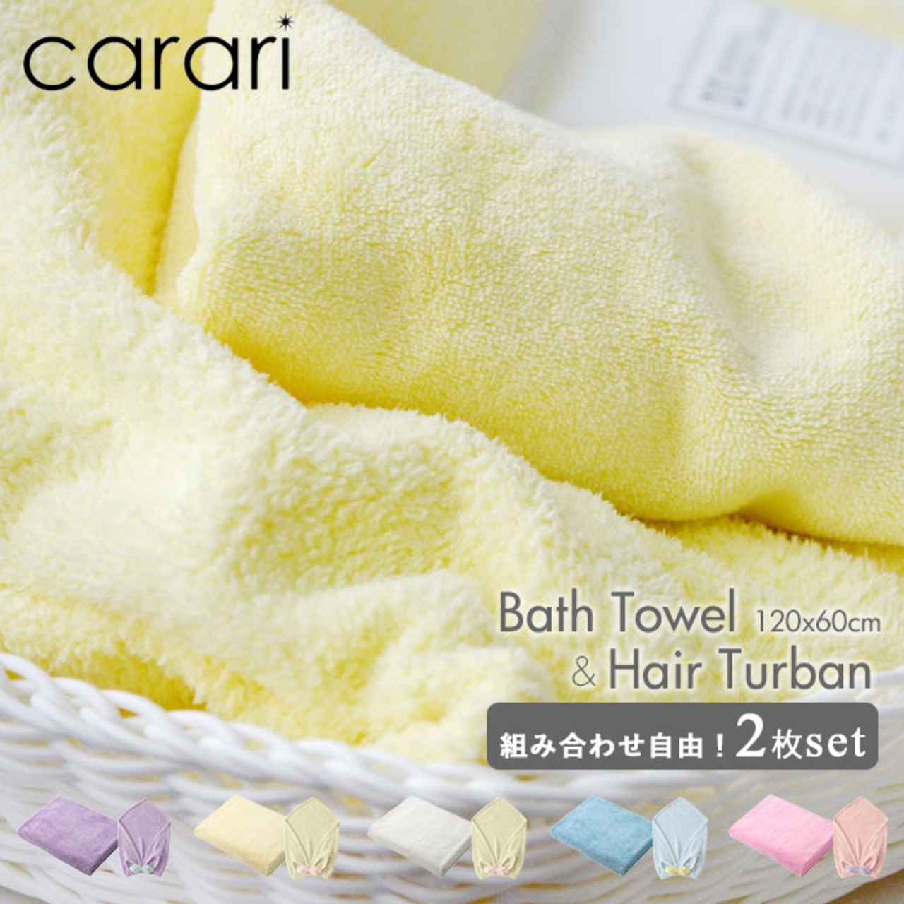 ・ふかふか・やわらか、まるでシルクのような肌触り!お風呂上りのボディにたっぷり大判サイズでしっかり吸水!Carari(カラリ)・マイクロファイバー・バスタオルと、お風呂上りの濡れた髪をすっぽり包んですばやく吸収、Carari mor(カラリモア)・マイクロファイバー・ヘアターバン。お好きなカラーがセレクトできる、おトクなセット。