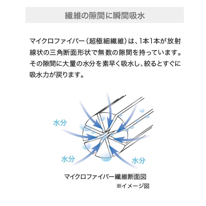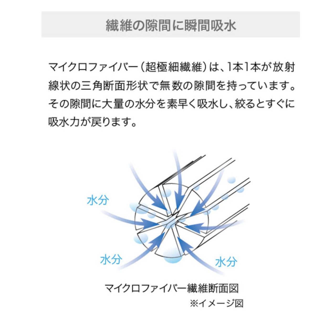 ・マイクロファイバー(超極細繊維)は、1本1本が放射線状の三角断面形状で、無数の隙間を持った繊維。繊維のすき間に大量の水分を素早く吸水することができ、絞るとすぐに吸水力が戻るのが特徴。