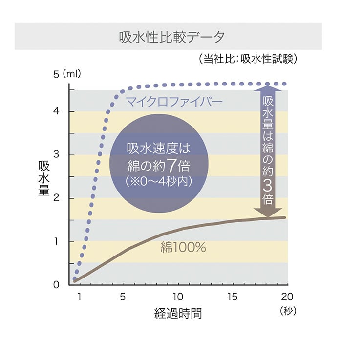 ・吸水量が綿の約3倍のマイクロファイバー生地!繊維の間にある大量の隙間で水分を一時的にため込んで、グングン吸水!通気性に優れた繊維なのでお洗濯後もすぐ乾く!