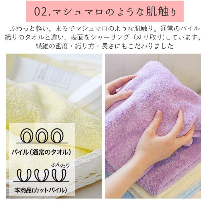 ・通常のタオル生地では繊維をパイル状(リング状)に織って仕上げるところを、カラリ・マイクロファイバー・バスタオルではあえて繊維の表面を刈り取るカットパイル加工を施すことで、ふわふわで滑らかな肌触りを実現。
