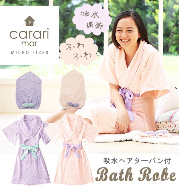 バスローブ ヘアターバン付き carari カラリモア 通販 吸水バスローブ ヘアターバンセット レディース ママ マイクロファイバー 吸水 速乾 吸水ヘアターバン かわいい おしゃれ パステルカラー お風呂上り 風呂 バスタイム やわらか ふわふわ もこもこ Aライン 5分袖