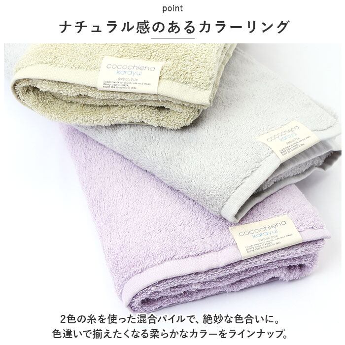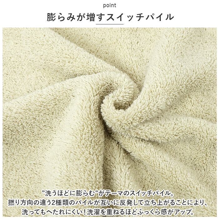 ・”洗うほどに膨らむ”がテーマのスイッチパイル。撚り方向の違う2種類のパイルが互いに反発して立ち上がることにより、洗ってもへたれにくい!洗濯を重ねるほどふっくら感がアップ。