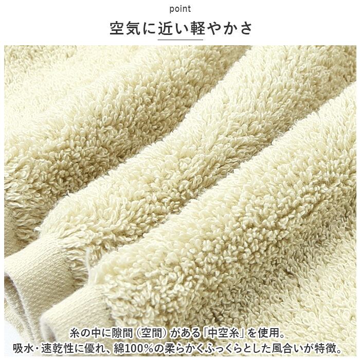・糸の中に隙間(空間)がある「中空糸」を使用。吸水・速乾性に優れ、綿100%の柔らかくふっくらとした風合いが特徴。