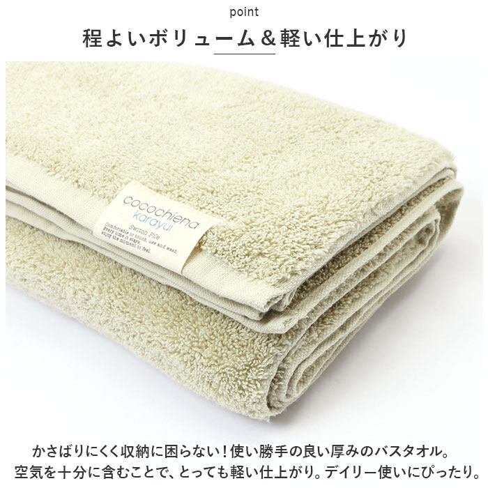 ・かさばりにくく収納に困らない!使い勝手の良い厚みのバスタオル。空気を十分に含むことで、とっても軽い仕上がり。デイリー使いにぴったり。