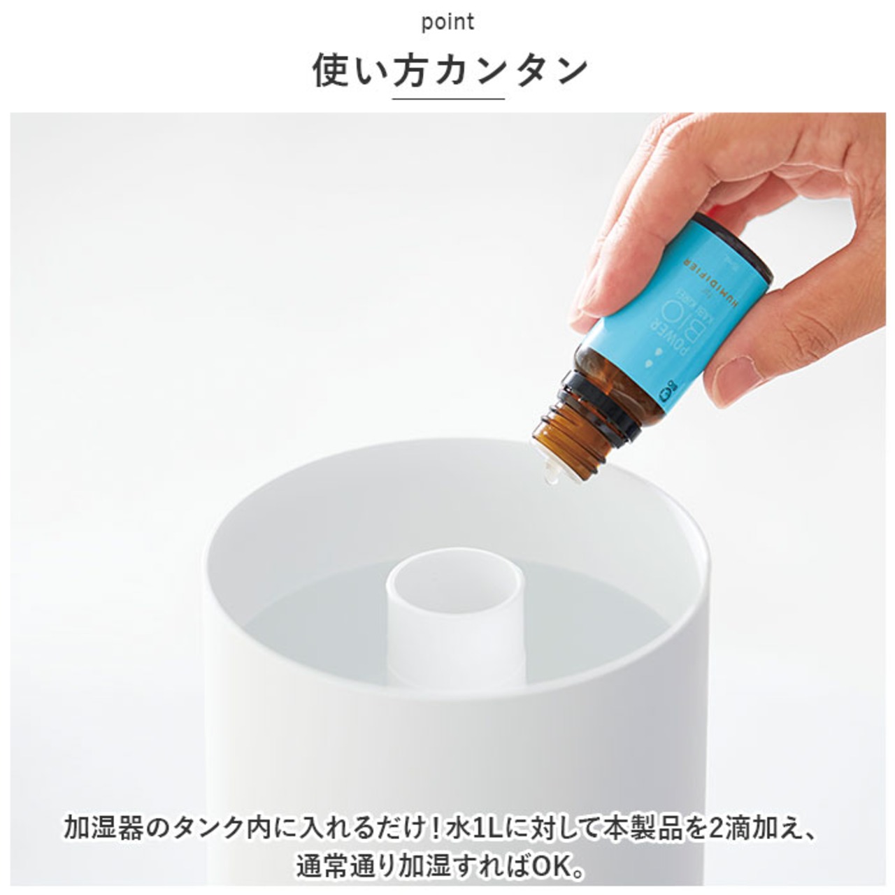 ・加湿器のタンク内に入れるだけ!水1Lに対して本製品を2滴加え、通常通り加湿すればOK。